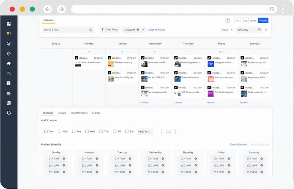 Manage the Content CalendarEasily review and manage TikTok content from a central publishing calendar—quickly filter by tag, profile and date.