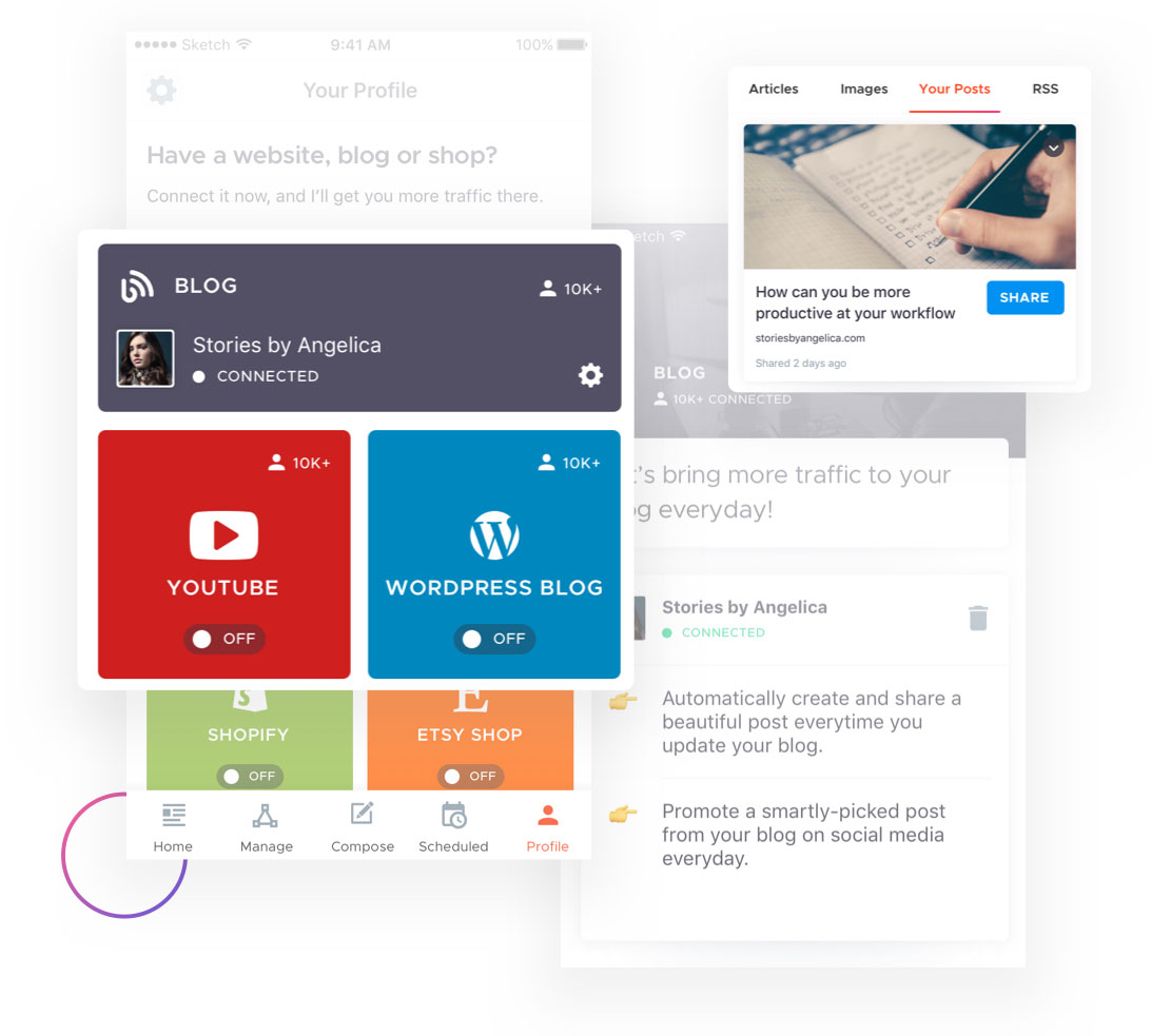 Keep an eye out for updates from your website, blog or online shops and create quick, beautiful posts for every update to easily share on all your social profiles!